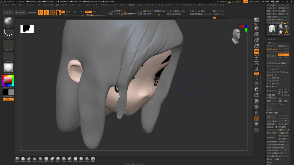 チャプター3で紹介されているSnakeHookブラシを使用し、髪の毛のざっくりとしたラフモデルを作っていた。