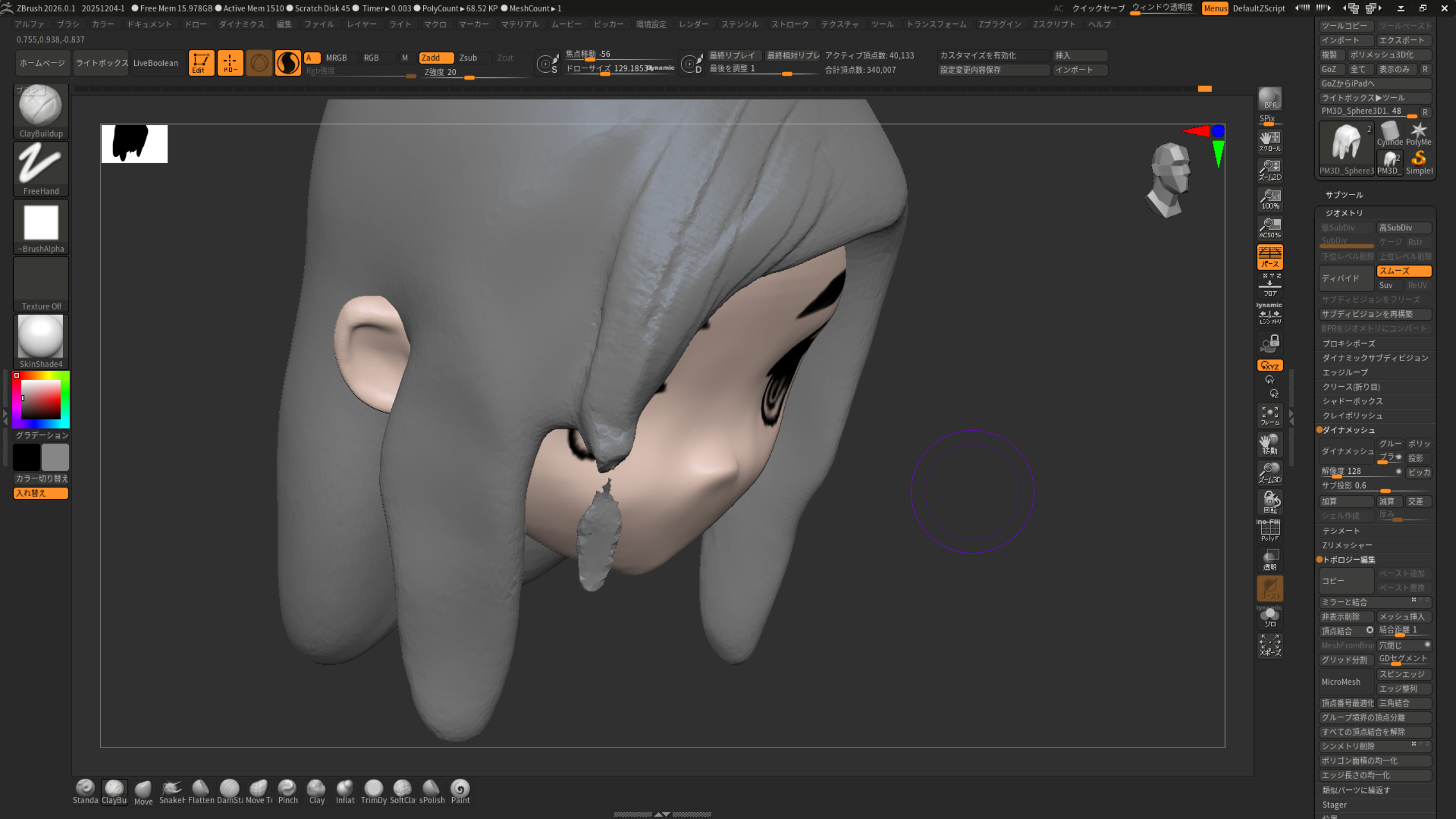 チャプター3で紹介されているSnakeHookブラシを使用し、髪の毛のざっくりとしたラフモデルを作っていた。